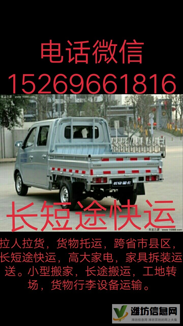 小型貨車,載人拉貨,省內長短途,急貨快運,專車運送,一站直達,運送貴重物品 安全 舒適 快速,貨物行李設備運送,拉摩托車電動車,冰箱冷柜等超高家電設備,家具拆解 組裝 運送。學生,租房族,打工族,單身貴族小型搬家,長途搬家,異地搬家,為上班族提供夜間服務,小型工程轉場,裝修清運,場地倒短。幫忙裝卸,收費低,歡迎聯系。